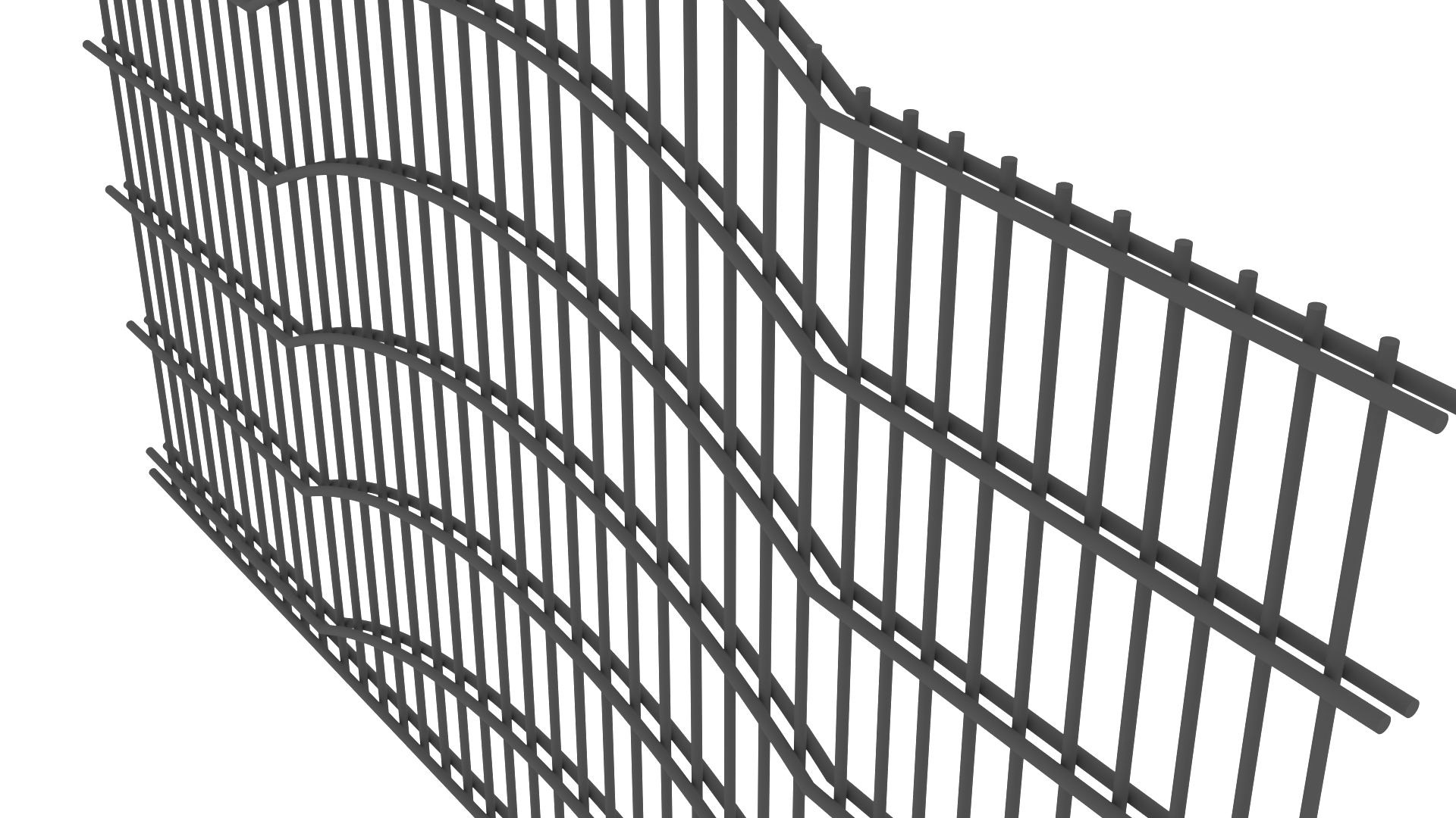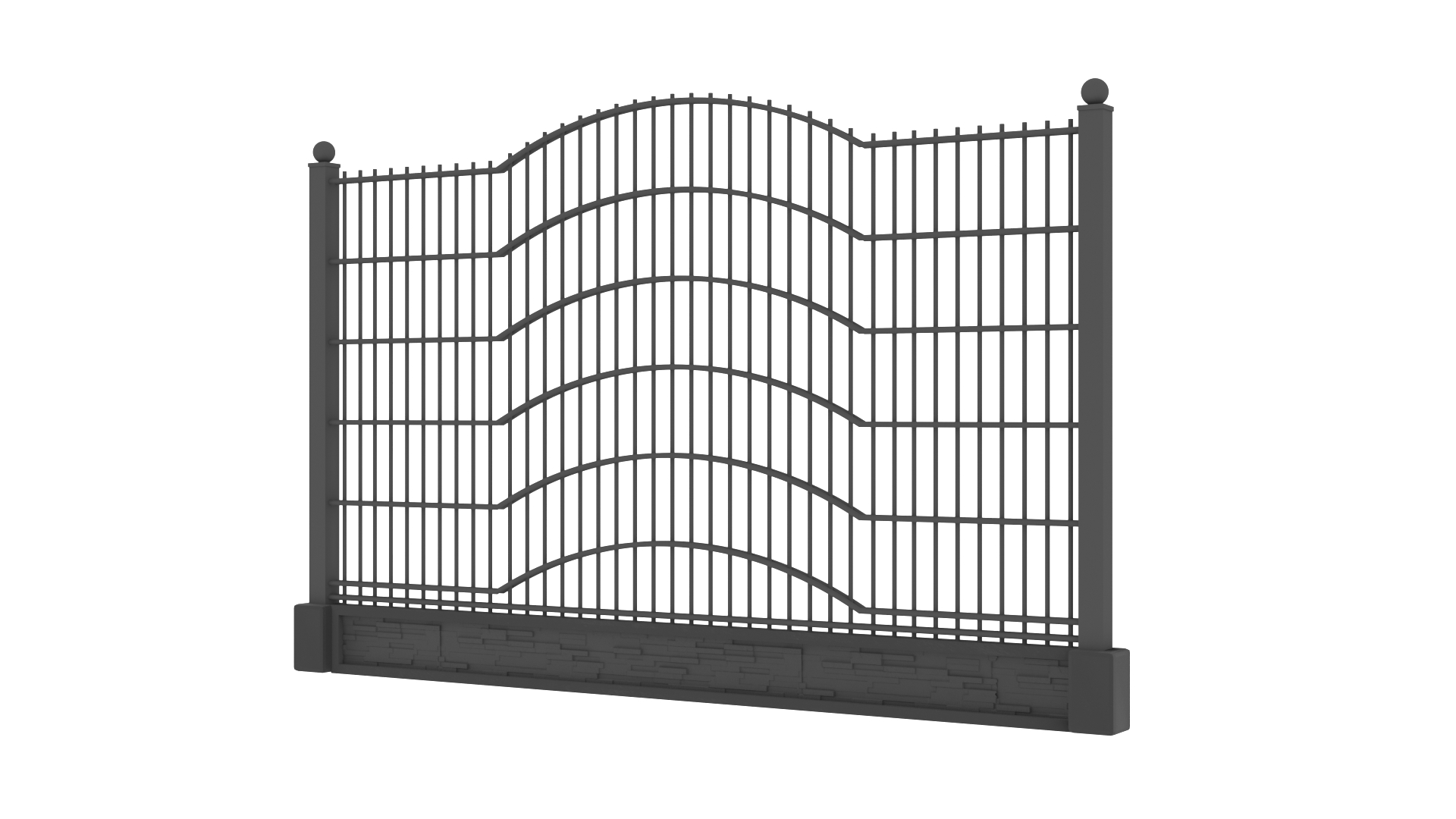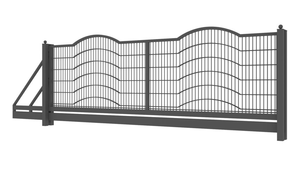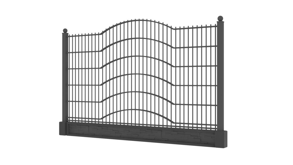 Panele tworzone są z drutów pionowych o średnicy 5mm oraz podwójnych prętów poziomych tworzących wzór o średnicy 8mm. Słupy zastosowane do przęseł to 60×60 lub 80×80 wyposażony w komplet obejm oraz zakończony metalowym daszkiem. Podmurówka ma wysokość 25cm, jest montowana na łącznikach betonowych lub ceownikach metalowych. Do każdego wzoru produkujemy bramy dwuskrzydłowe lub przesuwne oraz furtki.