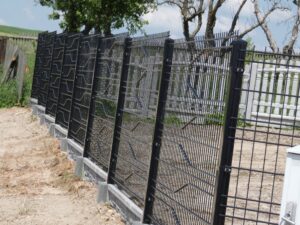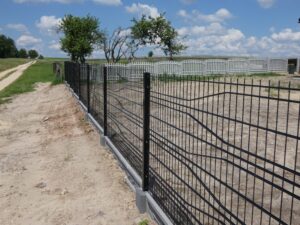 Przęsła, które tworzymy są bardzo łatwe w montażu. System ich instalacji jest identyczny jak w przypadku paneli ogrodzeniowych 3D. Panele łączymy z słupkiem za pomocą obejmy montażowej. Przy słupku na dole, po zabetonowaniu go, stosujemy łącznik betonowy lub ceownik metalowy, w który wsuwamy płytę betonową.