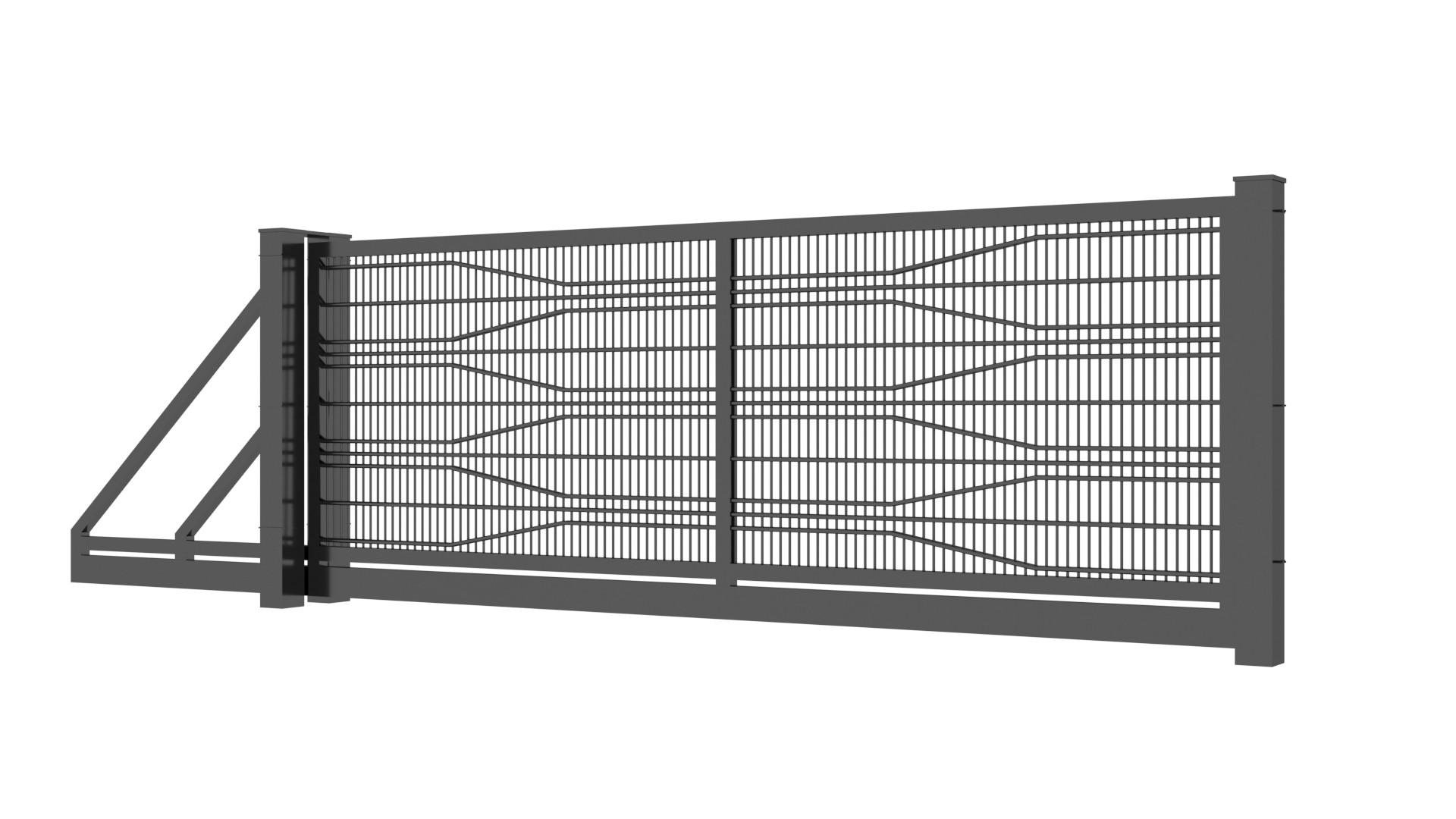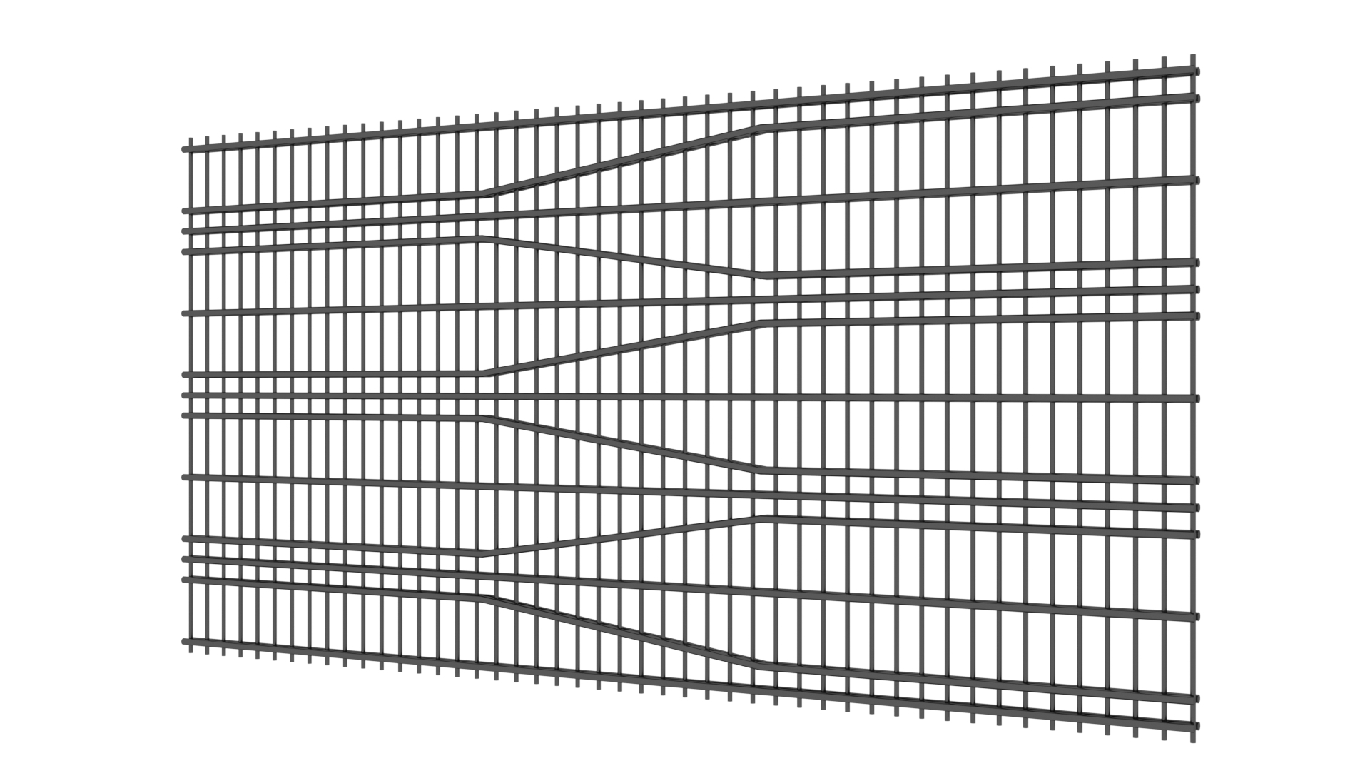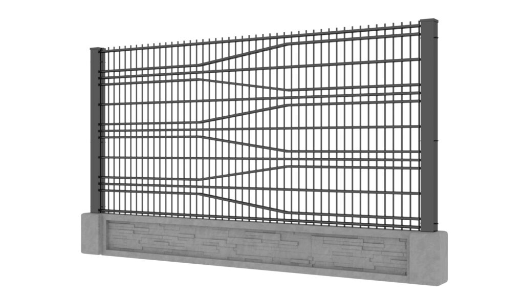 Panele tworzone są z drutów pionowych o średnicy 5mm oraz podwójnych prętów poziomych tworzących wzór o średnicy 8mm. Słupy zastosowane do przęseł to 60×60 lub 80×80 wyposażony w komplet obejm oraz zakończony metalowym daszkiem. Podmurówka ma wysokość 25cm, jest montowana na łącznikach betonowych lub ceownikach metalowych. Do każdego wzoru produkujemy bramy dwuskrzydłowe lub przesuwne oraz furtki.
